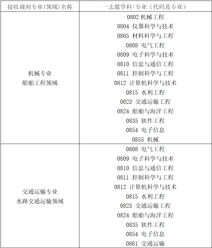 按照教育部2024年全国硕士研究生统一入学考试有关文件要求及省考试院通知,动漫花园 2024年全日制专业学位硕士研究生尚有缺额,将继续开通调剂系统。如有意愿调剂动漫花园 机械船舶工程领域和交通运输专业水路交通运输领域的考生,请及时登录中国研究生招生信息网“考生调剂系统”填报调剂志愿申请,本学院调剂接收初试门类为08工学,具体学科专业见下表。