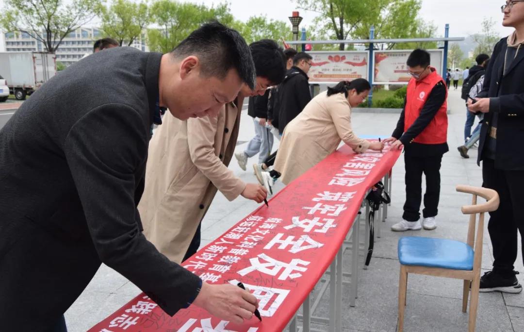 全校师生在红色横幅上签下自己的名字,做出自己的承诺。承诺从此刻开始,高度关注防灾减灾工作,树立风险意识,掌握逃生技巧,同时行动起来,为防灾减灾献计献策,减少身边的灾害风险,共同构筑起一道抵御灾害的坚实防线。