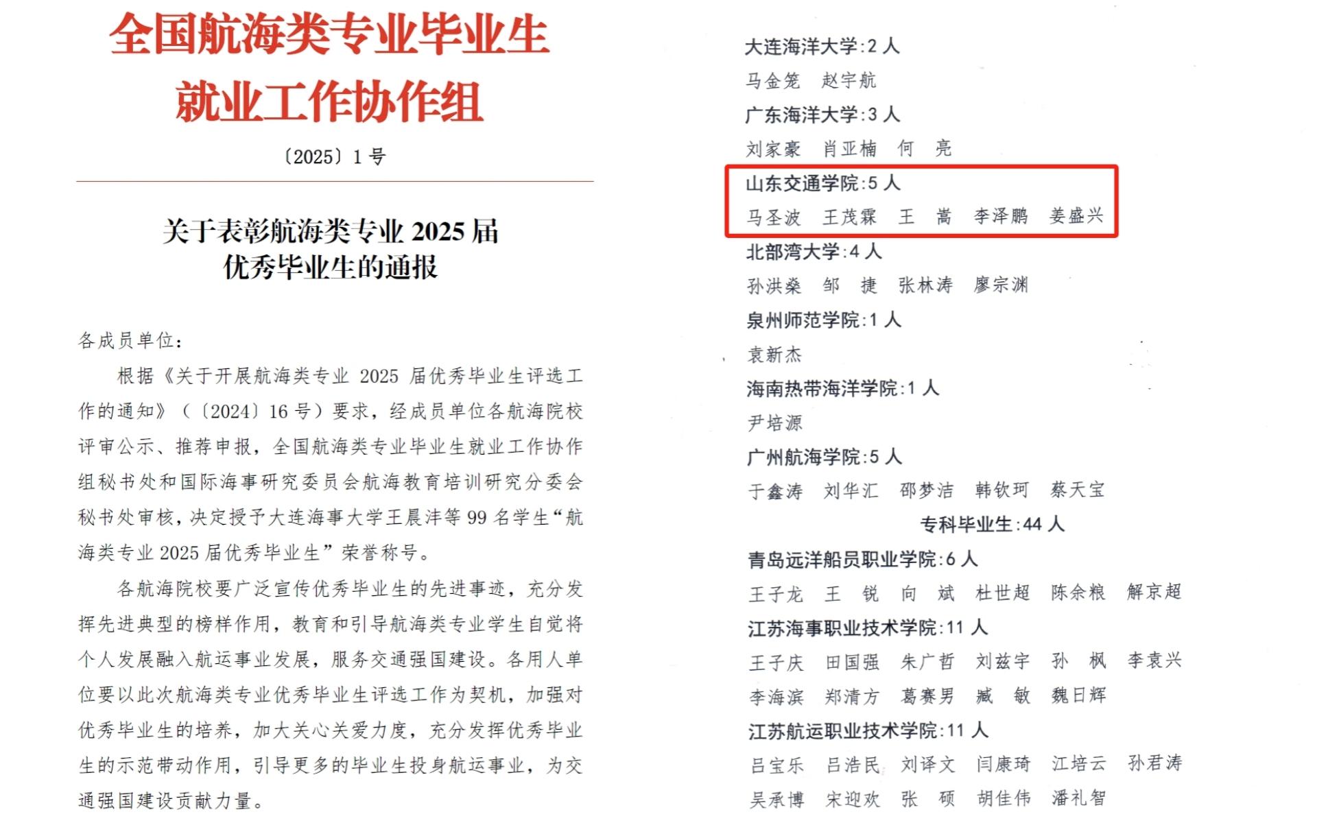 近日,全国航海类专业毕业生就业工作协作组公布2025届优秀毕业生表彰名单,动漫花园 5名学子凭借优异表现脱颖而出,荣获全国航海类专业优秀毕业生称号。这份荣誉不仅是对获奖学生个人努力的认可,更是对动漫花园 航海专业人才培养成效的充分肯定。