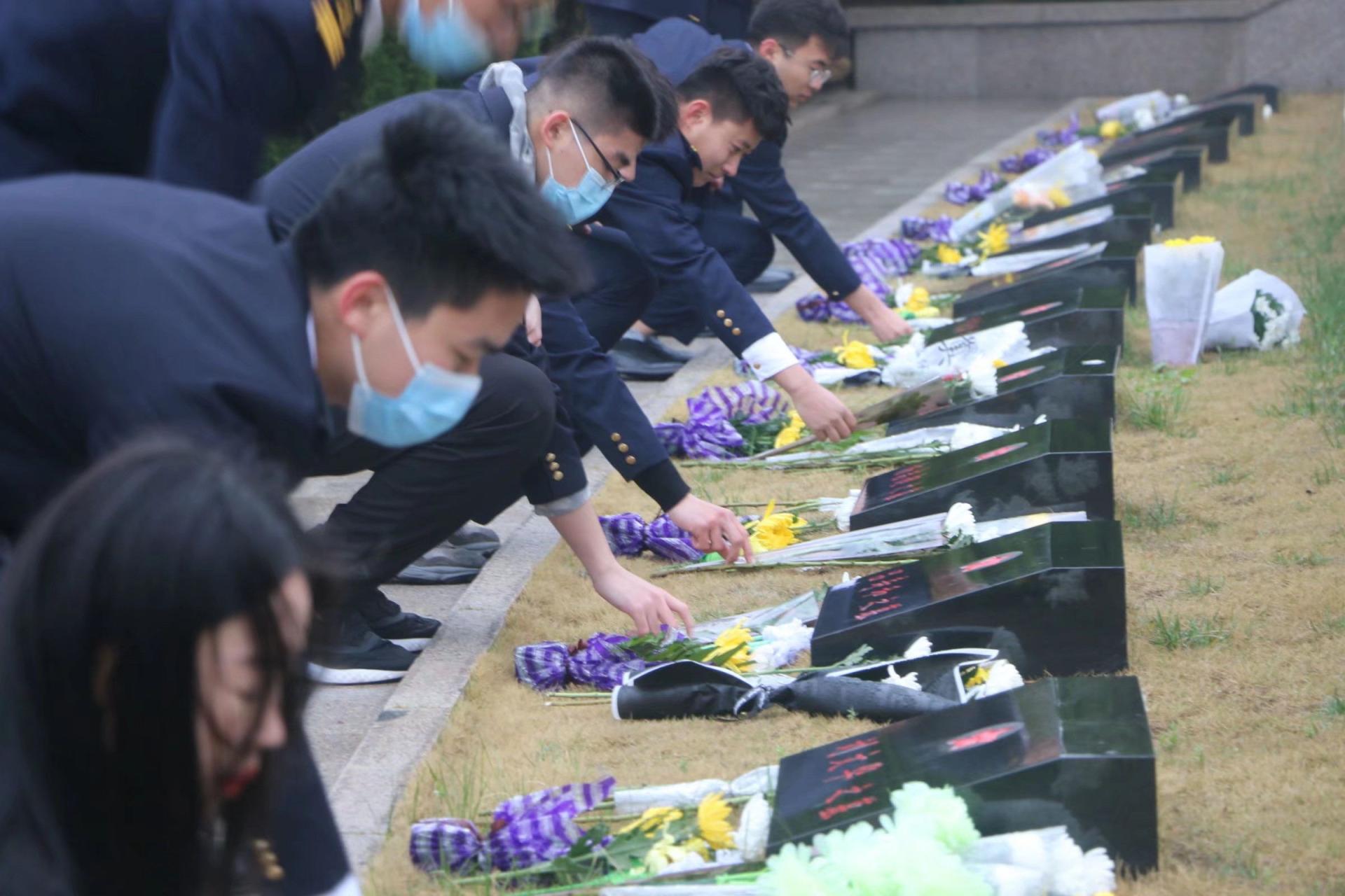 师生为革命烈士献上鲜花并在烈士纪念碑前进行集体默哀,现场肃穆无声,庄重的氛围以表对革命烈士的崇敬和追忆,缅怀英烈们为国为民的赤诚之心。