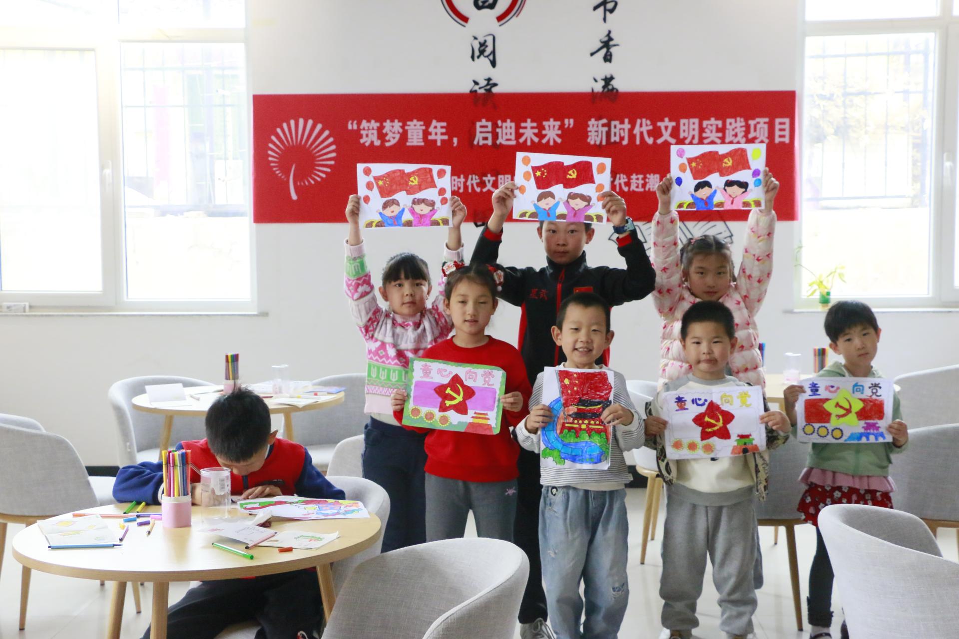 党史小课堂结束后,志愿者们带领孩子们进行绘画创作。孩子们一笔一画勾勒出五星红旗、党旗和天安门,把祖国建设的成就、家乡的发展绘成一幅幅美丽的图画。色彩斑斓的图画表达着孩子们对党对祖国美好的祝福,也展示了新时代少年儿童蓬勃向上的精神风貌。