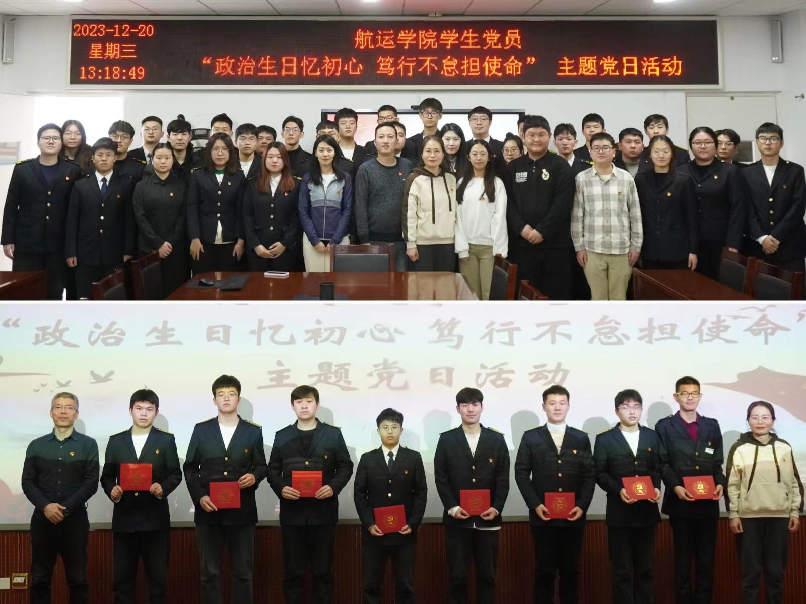 活动中,杜强向12月份过“政治生日”的32名党员赠送贺卡,勉励全体党员坚定不移听党话、跟党走,努力成长为堪当民族复兴重任的时代新人。学生党员分享了入党初心,讲述了自进入大学以来努力向党组织靠拢的经历,并对党组织的培养表达感谢。全体党员面向党旗重温入党誓词,接受党性的淬炼和思想洗礼,追忆入党初心,时刻牢记党员身份,永葆共产党人的政治本色。