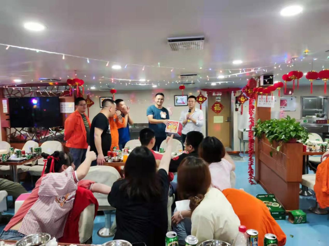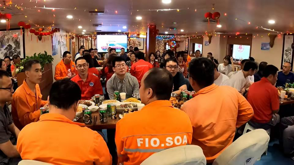 餐厅里张灯结彩,船队员们欢聚一堂吃年夜饭