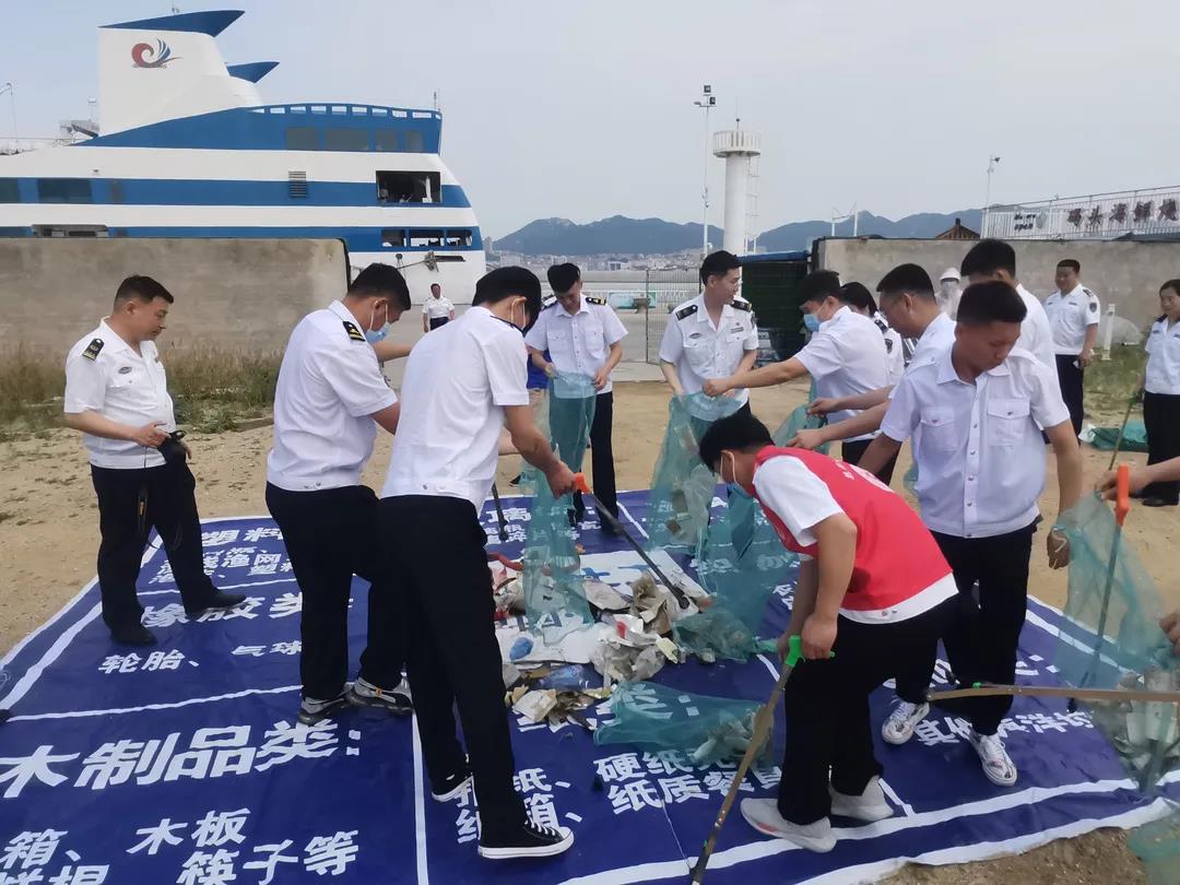 新时代文明实践志愿服务队携手威海市华益公益服务中心、威海海事局刘公岛海事处、烟台航标处成山头航标管理站、烟台航标处威海航标管理站、山东侨乡国际旅游有限公司共同开展“爱护碧水蓝天、守护纯净威海”海洋日环保主题活动。