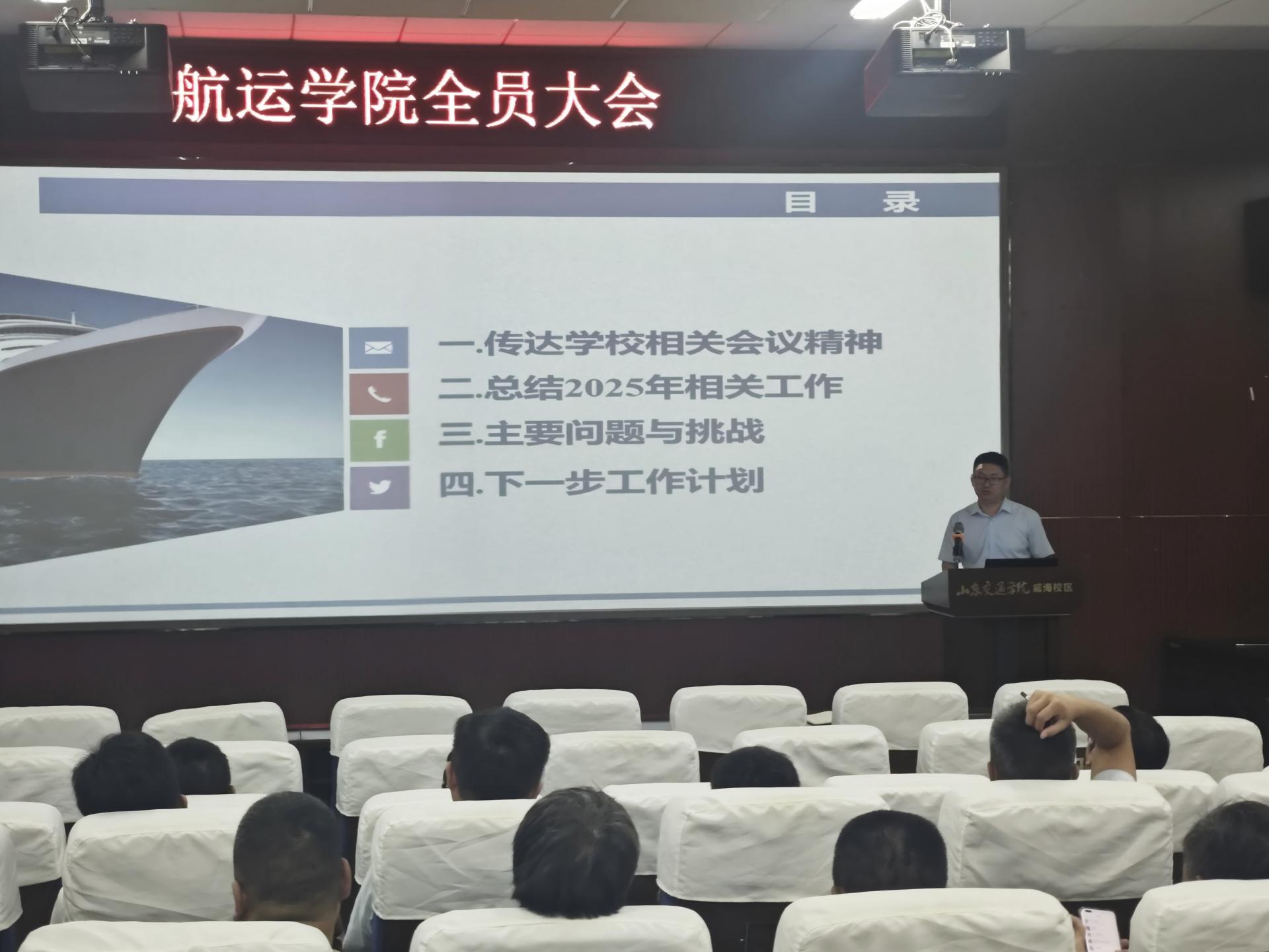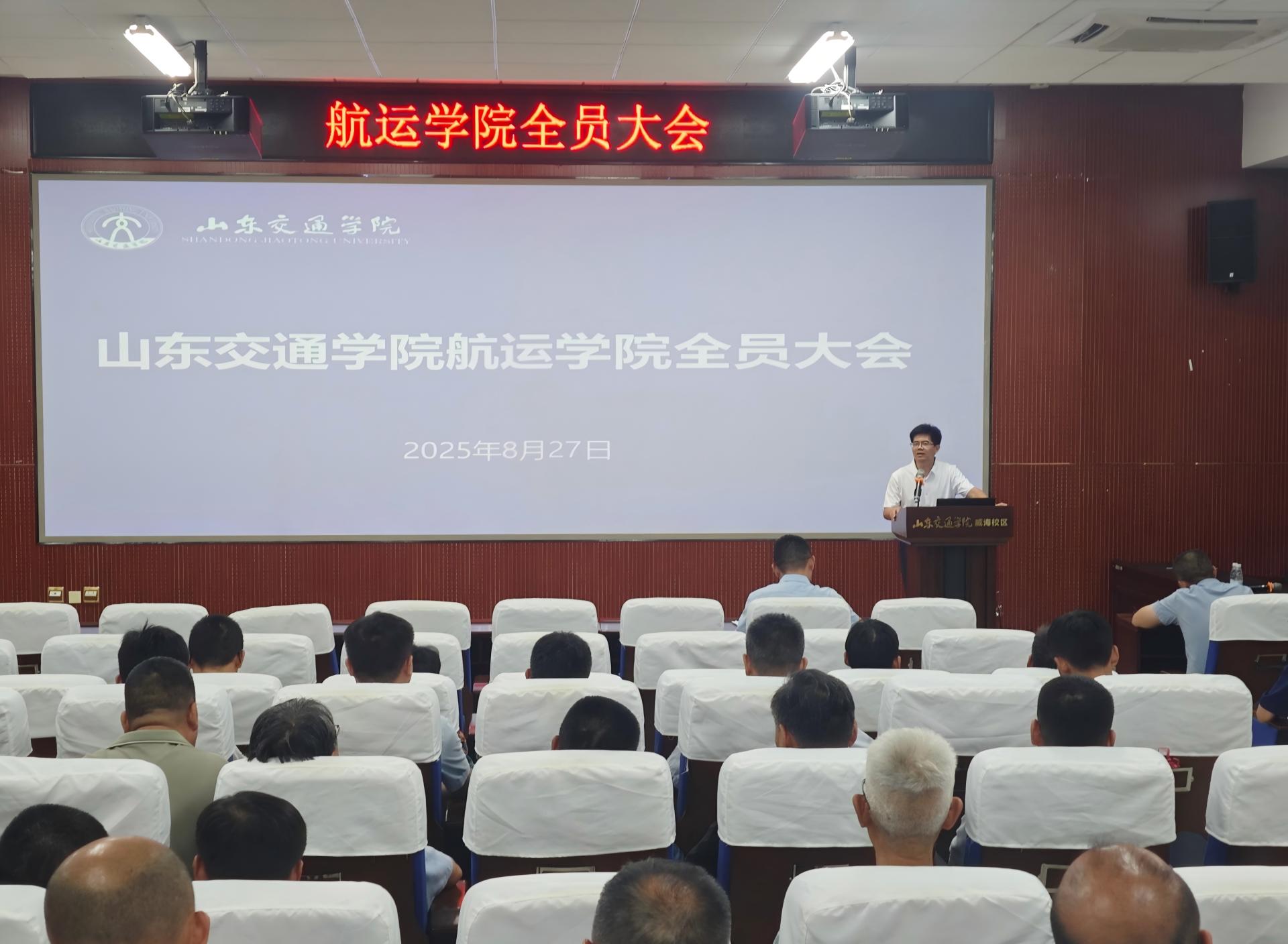 在威海校区第二报告厅召开2025秋季新学期全员大会,学院领导班子以及全体教师参加会议,会议由学院党委副书记、院长张强主持。